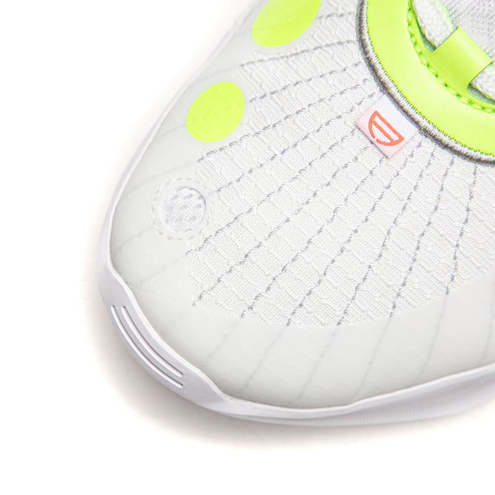 Inspirado en la aerodinámica de los vehículos motorizados, con patrones y elementos en la lengüeta, correa de velcro y talón que cuentan su propia historia.