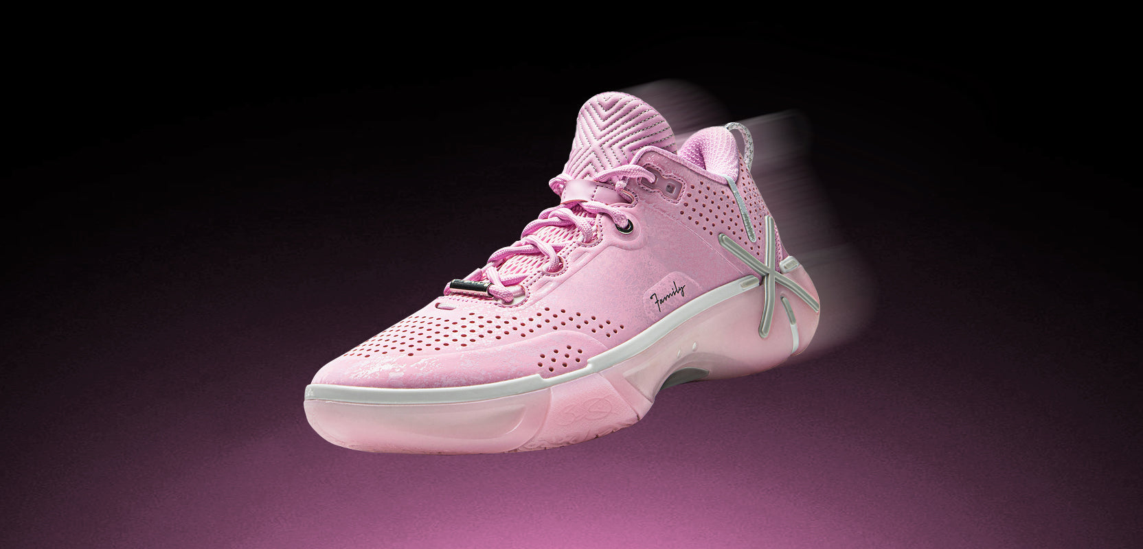 Parte superior de cuero rosa para una mejor textura. El logo de la marca Way of Wade está ubicado en el talón, y la palabra “Family” en un lado de la parte superior.